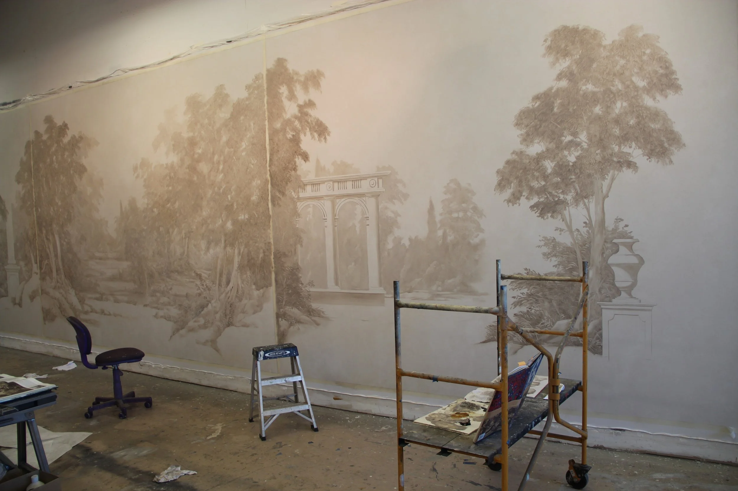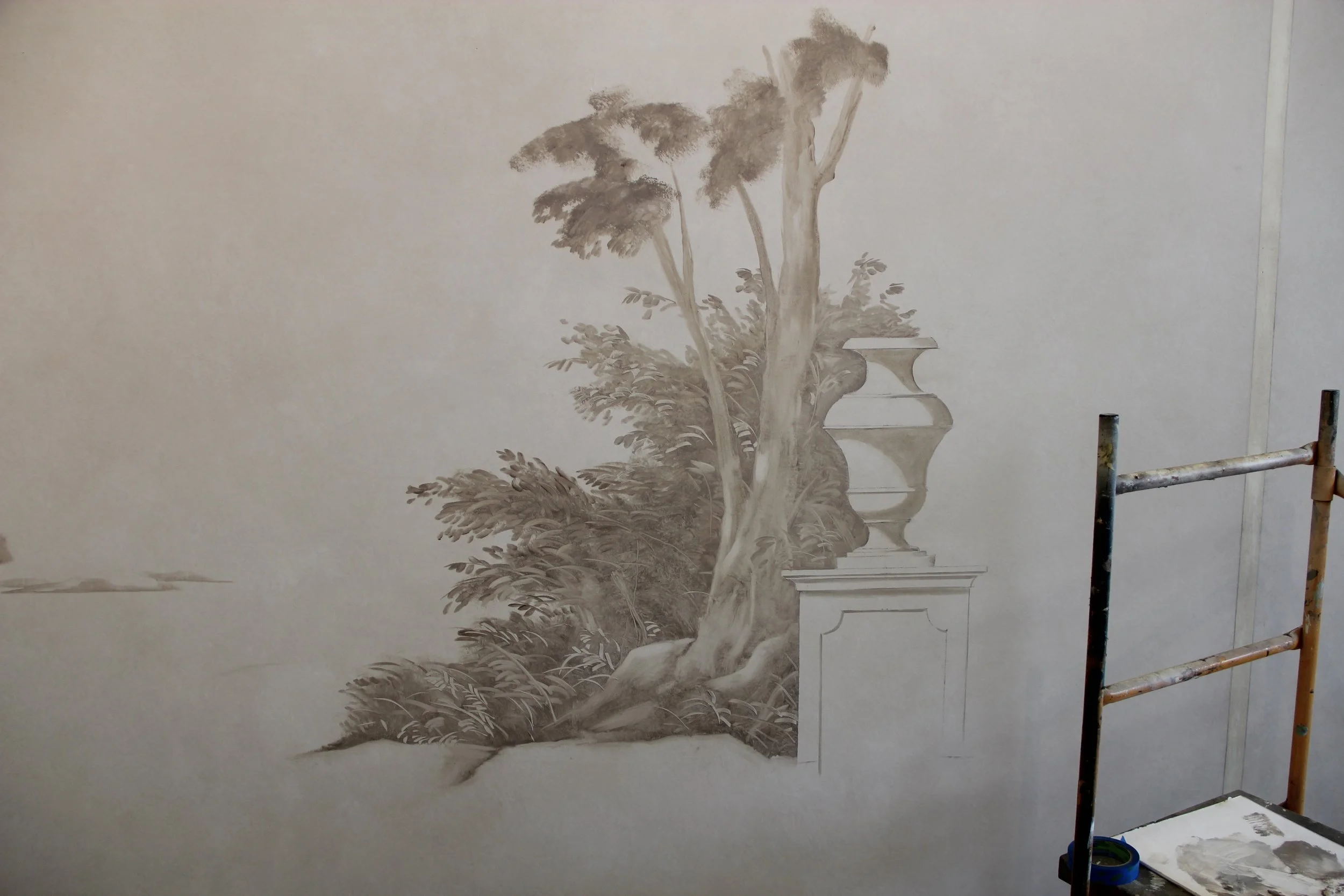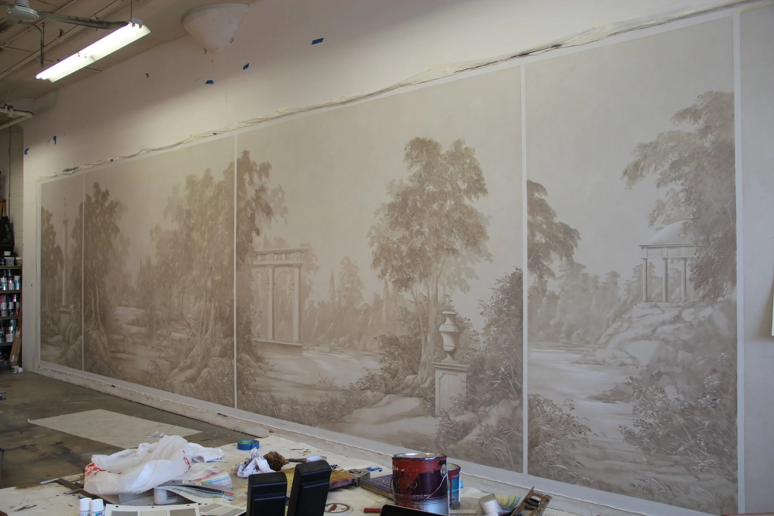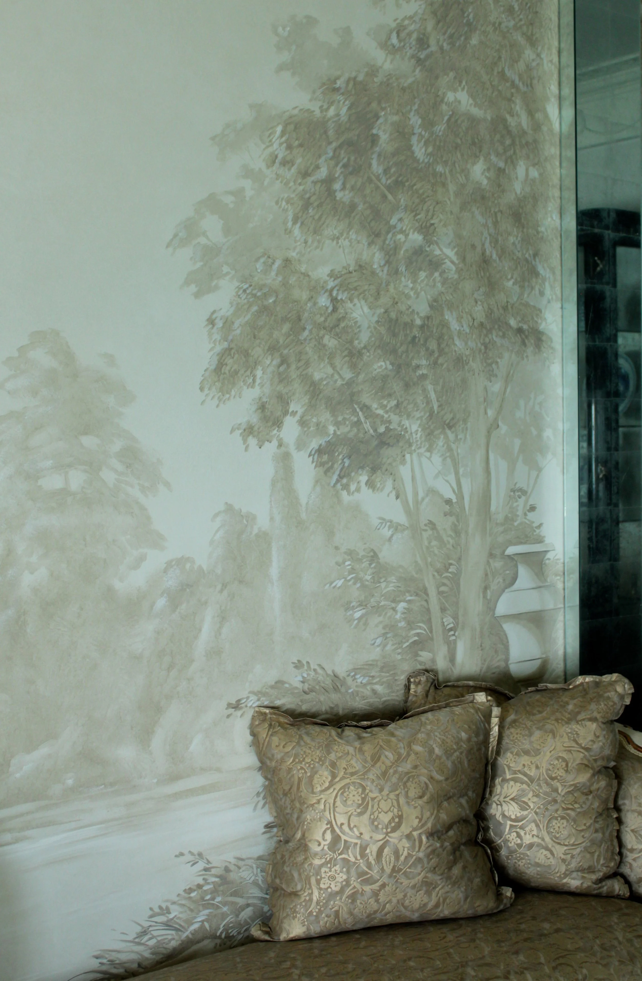 Using a warm grey palette of oil paints on canvas, we painted a series of custom-sized murals featuring a soft, lush landscape with classical architectural elements, which lend themselves especially well to grisaille work. The freshness and vitality of the brushwork elevates and distinguishes these murals from printed wall coverings.