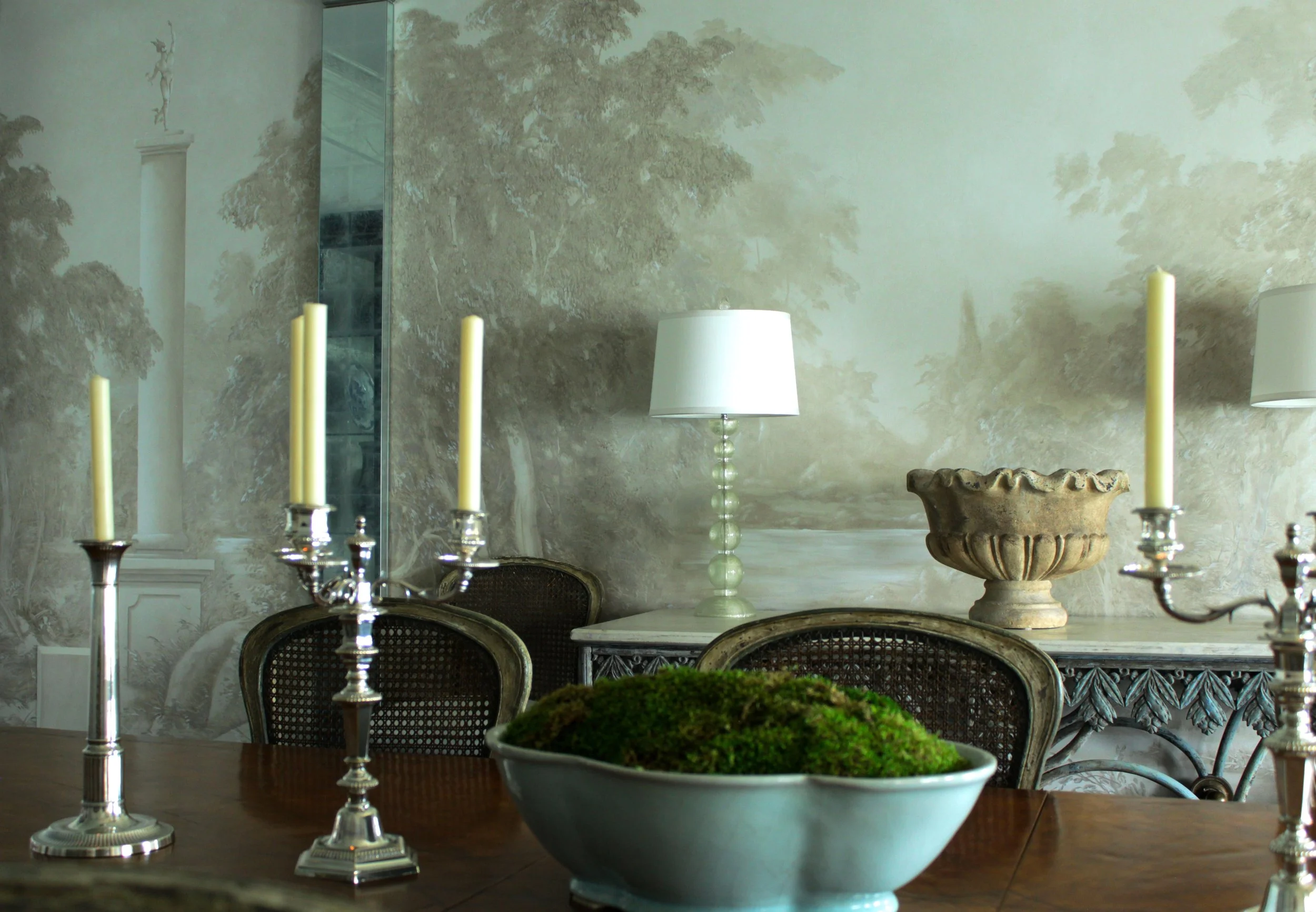 The panels were hand-painted in our studio, then installed on the dining room walls, from crown to baseboard, corner to corner. We added luminosity with silver leaf on the pilasters. The result is an extraordinarily elegant room. This mural work won an Acanthus Award from the Institute for Classicism in Architecture and Art.